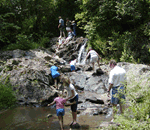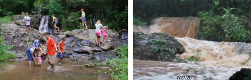 The Ormand reunion grounds at the site of the Ormand Furnace has a creek running through with a small waterfall. At the 116th reunion on 7/27/2013 it rained, big time. Of the 125 or so who attended no one could recall rain at a reunion. Water ran across the shelter floor and pattered against the roof, yet folks continued to enjoy the food and fellowship as normal. A few even hiked in the rain up to the falls just to see how different the falls were from normal.